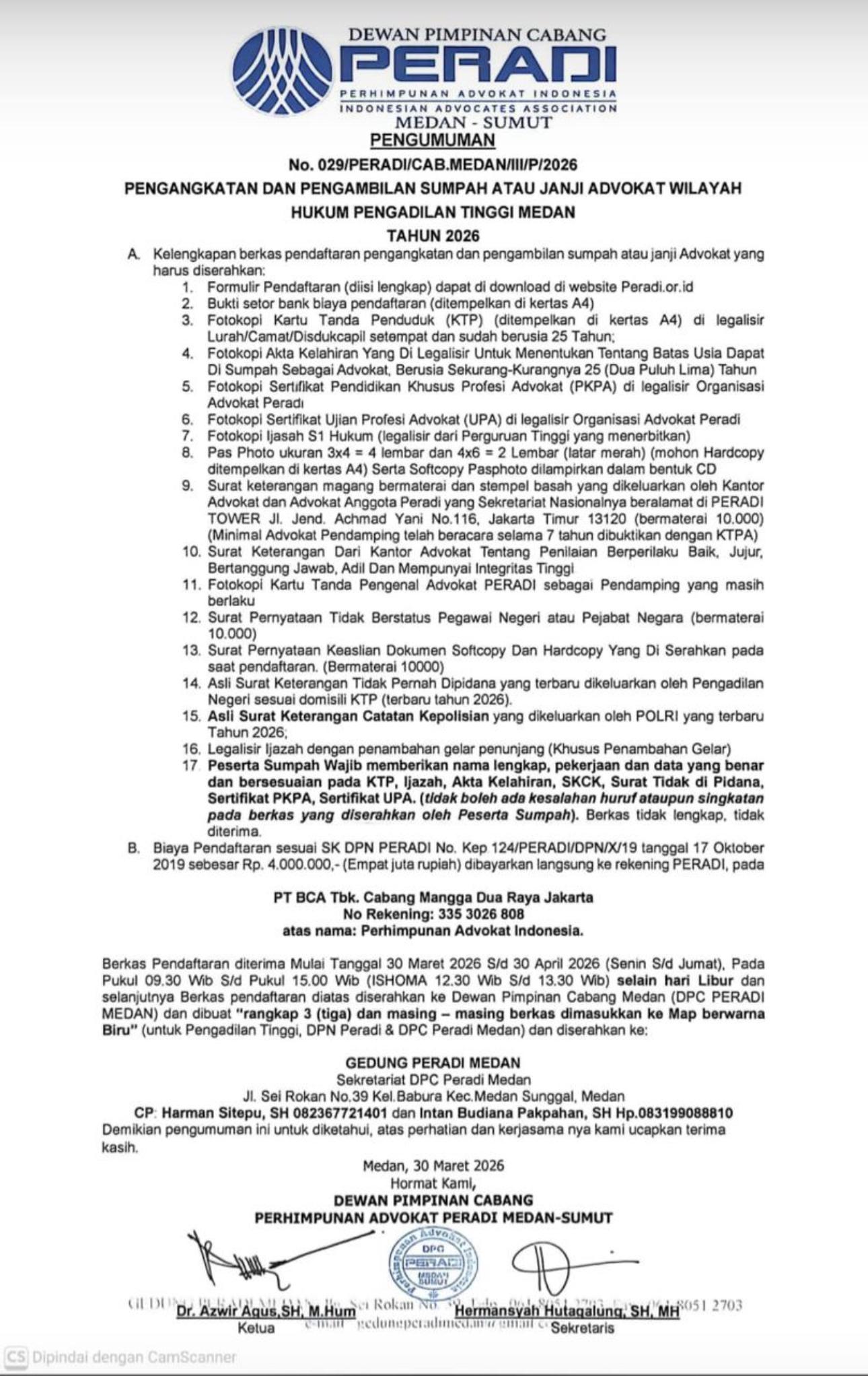 Dewan Pimpinan Cabang Perhimpunan Advokat Indonesia (PERADI) Medan-Sumatera Utara secara resmi mengeluarkan pengumuman terkait pelaksanaan pengangkatan dan pengambilan sumpah atau janji advokat untuk wilayah hukum Pengadilan Tinggi Medan tahun 2026.